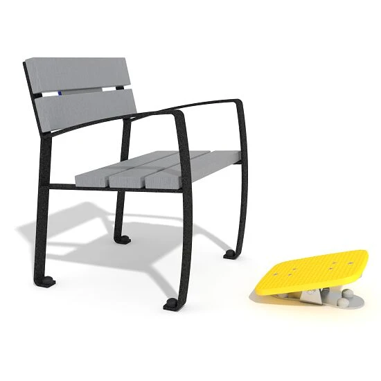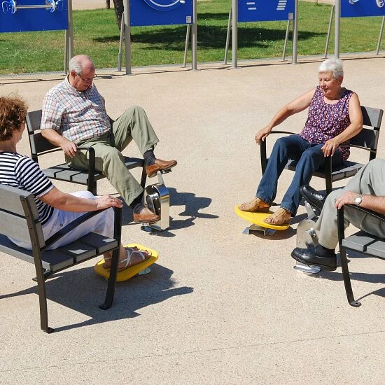 Beim Agapito Outdoor-Fitnessgerät „Fuß-Kipper“ bewegen Sie auf ganz einfache und doch sehr effektive Art die Füße. Die sitzende Position entlastet die Fußgelenke. Die Armlehnen bieten zusätzliche Haltemöglichkeiten. Der wetterfeste Einzelsitz ist umweltfreundlich aus Recycling-Kunststoff mit umlaufendem Stahlgestell gefertigt. Er bietet zudem eine aufrechte und ergonomische Sitzposition. Leichte Übungen mit geringem Neigungswinkel können bei diesem Geräte ebenso ausgeführt werden wie stärkere Kipp-Bewegungen, die den gesamten Unterschenkel-Bereich fördern. Muskulatur und Gelenke kommen schonend in Bewegung. Feste Gummipuffer an der Unterseite der rutschfesten, gelben Kipp-Bretter begrenzen den Neigungswinkel.
