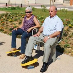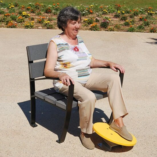 Die Drehbewegungen mit einem oder beiden Füßen stimulieren den gesamten Körper von der Hüfte abwärts. Insbesondere die seitlichen Bewegungen helfen dabei, die stützende Funktion der Bänder und Gelenke zu stärken und leisten dadurch einen wertvollen Beitrag zur Sturzprävention. Mit leicht kreisenden Bewegungen wird die Mobilität der Gelenke gefördert. Sanfte Dehnungen in Verbindung mit kontrollierten Kontraktionen erhöhen Trittsicherheit und Gleichgewichtsverhalten. Auf der auf einer Kugel gelagerten Scheibe werden die Übungen entsprechend dem persönlichen Wohlbefinden und Bewegungsvermögen im Sitzen ausgeführt. Die technische Begrenzung der rutschfest ausgeführten Fuß-Kreisel ermöglicht eine Kipp-Bewegung entsprechend des natürlichen Bewegungsablaufes. Der wetterfeste Einzelsitz mit Armlehnen gibt zusätzlichen Halt und sorgt für eine aufrechte, ergonomische Sitzposition.