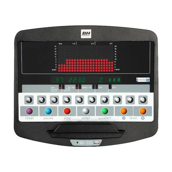 - Anzeige von Geschwindigkeit, Zeit, Entfernung (km), Kalorien, Steigung, Pulsation in Watt, Widerstand und Puls