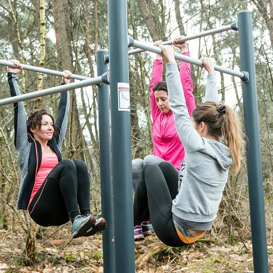 Die Kompan Outdoor-Fitness-Station „Klimmzug“ gibt es in der AusfĂĽhrung mit 4 und mit 6 Klimmzugstangen. Sie lassen sich von Mehreren gleichzeitig nutzen. Dazu sind sie vielseitig und eignen sich fĂĽr KlimmzĂĽge oder auch fortgeschrittenen Ăśbungen wie den Flying Monkey. Hier hangeln sich die Sportler von Stange zu Stange.