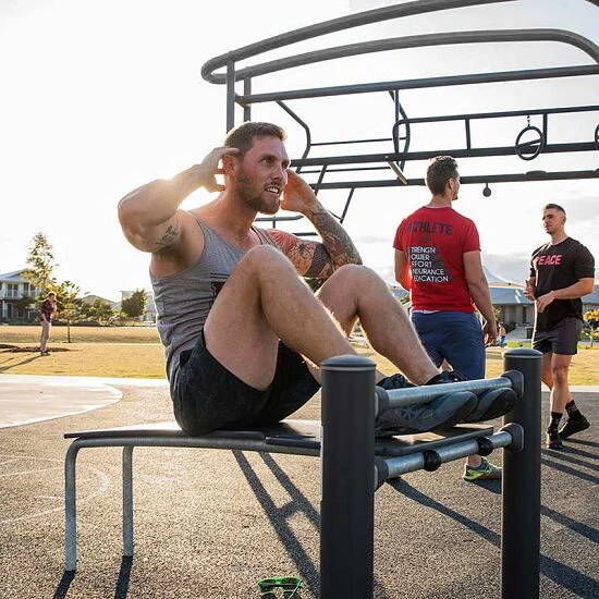Die Kompan Outdoor-Fitness-Station „Pro 2“ bietet eine besonders robuste und kompakte sowie effektive Ausstattung. Die Schrägbank ermöglicht das Trainieren der Rumpf- und RĂĽckenmuskeln und eignet sich beispielsweise fĂĽr Ăśbungen wie Leg-Lifts sowie Sit-Ups – der Kreativität sind hiermit keine Grenzen gesetzt. Alle Stangen, die fĂĽr KlimmzĂĽge vorgesehen sind, bestehen aus massiven, feuerverzinkten Stahlstangen. Die Griffe sind in 4 Höhen angebracht: 48 cm, 76 cm, 104 cm und 132 cm. Dadurch lässt sich der Schwierigkeitsgrad der Ăśbungen variieren und an jeden Trainingsstand anpassen.