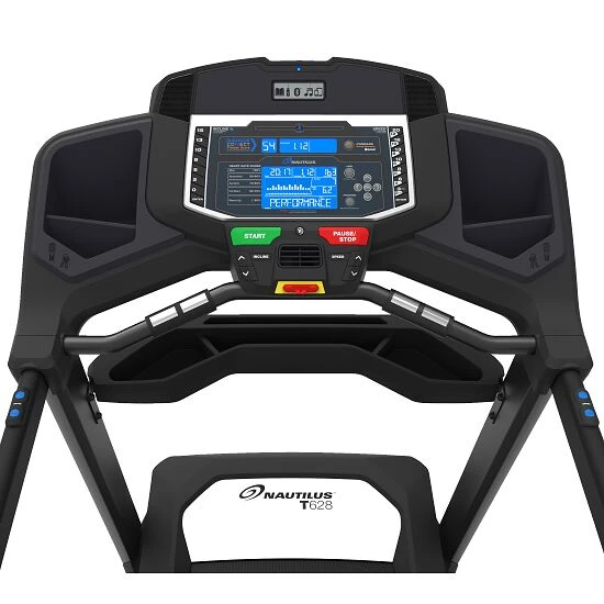 Beim Nautilus Laufband „T628“ haben Sie alle wichtigen Informationen, dank zweier hochauflösender STN-LCD Monitore, immer im Blick. Der Trainingscomputer des elektronischen Laufbandes bietet Ihnen 26 Programme in 4 Benutzerprofilen. 6 Programme sind pulsgesteuert. Dabei gibt ihr Herz den Takt vor – durch die HerzfrequenzDie Herzfrequenz (HF) oder auch Herzschlag-Frequenz ist die Anzahl der Herzschläge pro Minute. Sie ist abhängig von der Belastung, vom Alter und der körperlichen Fitness.Bei einem gesunden Menschen liegt diese Frequenz im Ruhezustand bei 50 bis 100 bpm (beats per minute). werden sowohl Geschwindigkeit als auch Steigung reguliert – Die Maximalgeschwindigkeit des elekronischen Laufbandes mit Motor beträgt 20 km/h, die Steigung 15 %. Die Messung erfolgt über Sensoren in den Armstangen oder über den im Lieferumfang enthaltenen BrustgurtDie Pulsmessung mit einem Brustgurt ist die exakteste Form der Pulsmessung. Die Herzfrequenz wird durch einen Sensor am Brustgurt gemessen und kabellos an den Trainingscomputer übertragen..