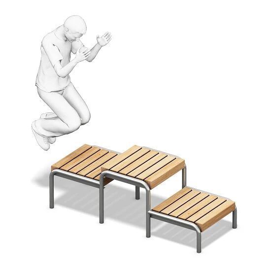 An der Playparc Calisthenics-Anlage „Squat-Plattform“ lassen sich dank der unterschiedlichen Höhen verschiedenste Sprungvariationen durchfĂĽhren – ob vom Boden auf die unterschiedlich hohen Plattformen oder aber auch von Stufe zu Stufe. Die Squat-Plattformen bieten auf kleinem Raum vieleitige Funktionen, ob als Jump-Box oder Skipping-Bank.