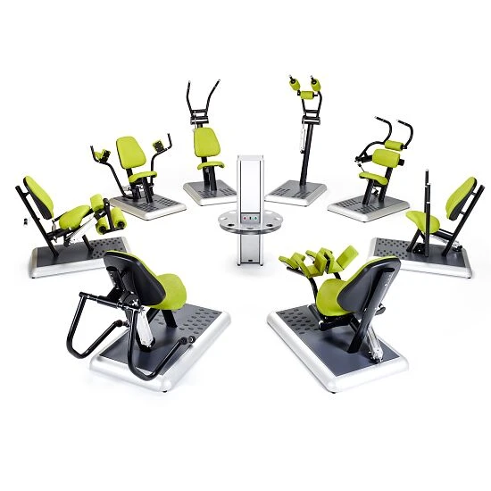 Die Sport-Thieme Hydraulische Bizeps-/Trizeps-Maschine stellt mit 7 weiteren Fitnessgeräten einen Fitnesszirkel dar. An jedem Gerät trainieren Sie eine andere Muskelgruppe, sodass ein vielseitiges Workout entsteht. Besonders für Group-Fitness-Kurse in Fitnessstudios eignet sich der Fitnesszirkel hervorragend. Sie verfügen über wenig Platz im Fitnessstudio? Auch hier überzeugen die Fitnessgeräte – dank kompakter Maße jedes einzelnen Gerätes, nehmen alle Geräte zusammen gerade mal eine Fläche von 25 qm ein.